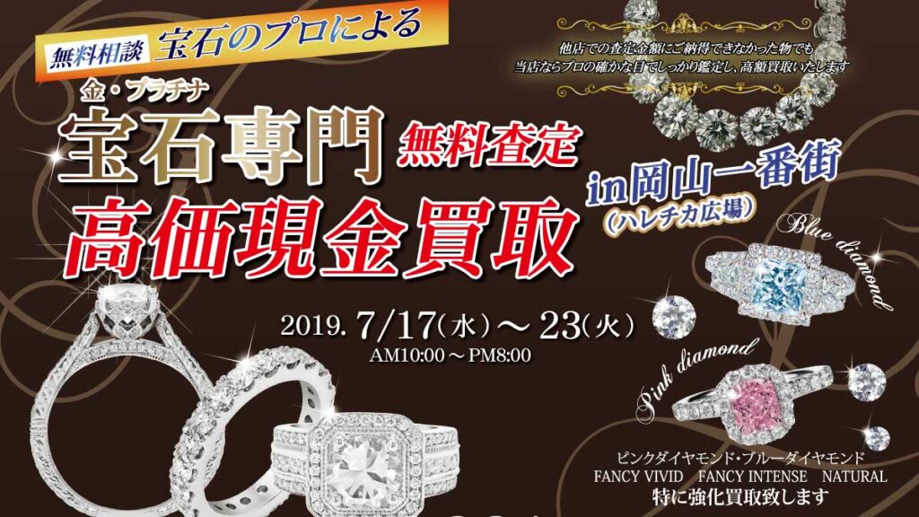 7月17日(水)〜23日(火)、岡山一番街ハレチカ広場にて「貴金属、宝石ジュエリー高価現金買取・無料査定会」開催のお知らせ