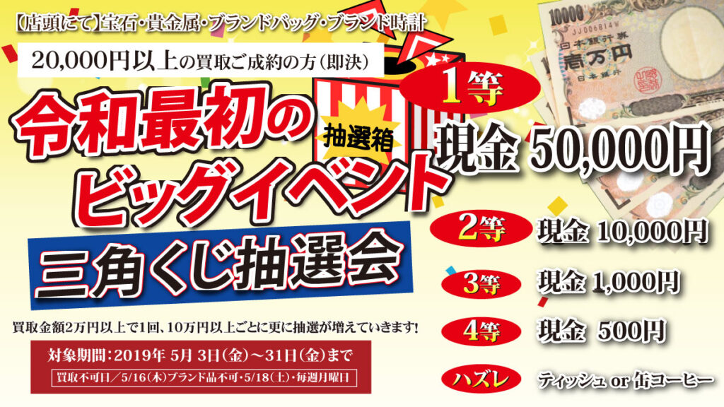 【店頭】5/3(金)〜5/31(金)買取金額20,000円以上で【現金5万円が当たる三角くじ抽選会】